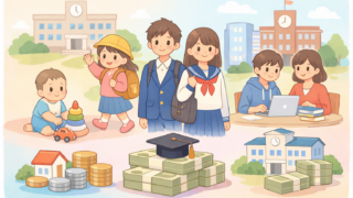 教育費 【最新版まとめ】0歳〜大学までにかかる教育費の総額はいくら?公立・私立パターン別シミュレーション 幼稚園から大学まで「全て公立」なら約840万円、「全て私立」なら約2,250万円。ミックスパターンも含めた3パターンを最新データで比較。2025年の支援制度情報も合わせて解説します。 2026.02.25 教育費